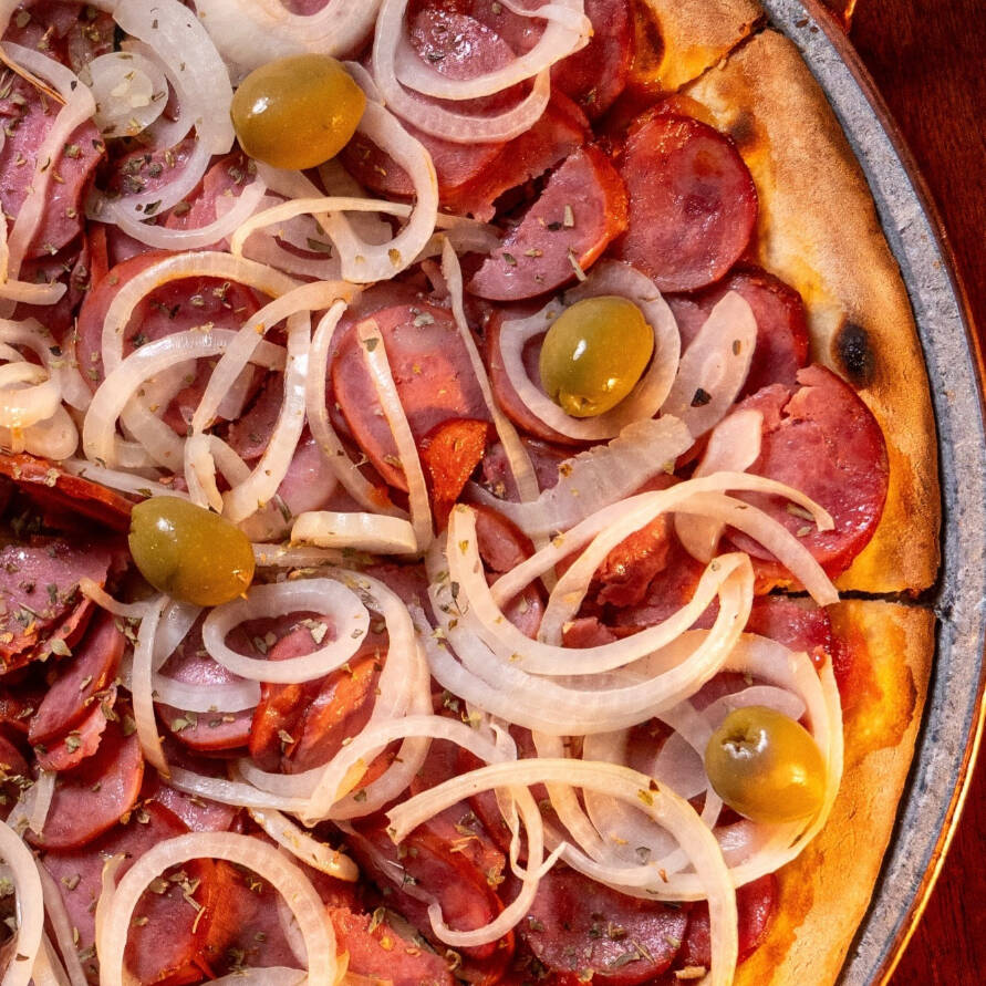 Nossa pizza de calabresa no forno a lenha traz aquele sabor tradicional que faz a diferença. Calabresa fatiada, cebola, azeitonas e orégano, em uma massa assada com cuidado e muito sabor.
