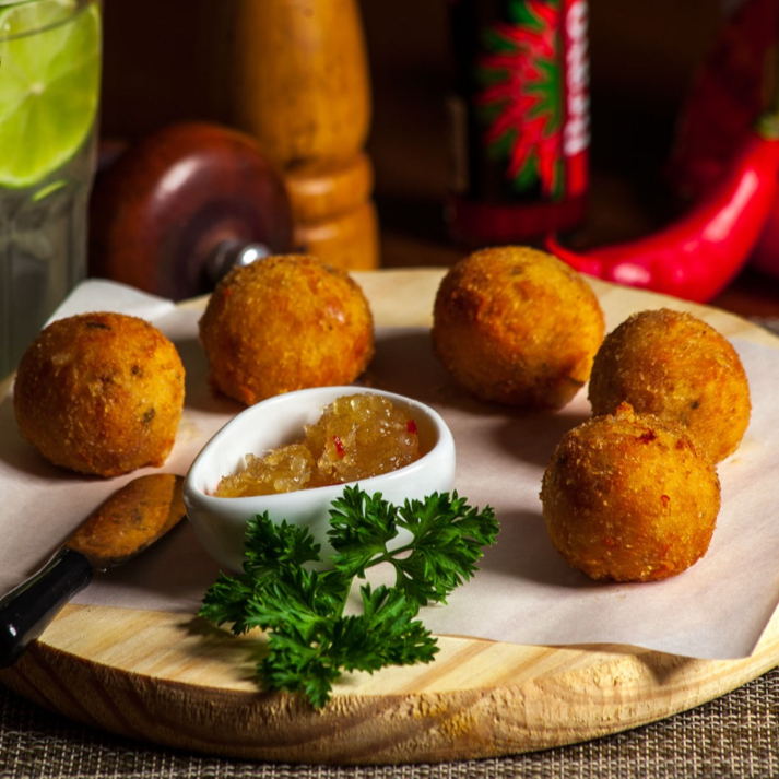 Croquetes (5 unid) de Bechamel di Chianti com Presunto defumado artesanal. Acompanha geléia artesanal de Abacaxi com Pimenta