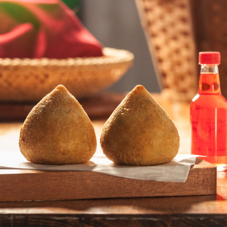 As nossas deliciosas Coxinhas de Frango em tamanho coquetel (60 gr) com 04 unidades. ASSADAS, NÃO FRITAS.