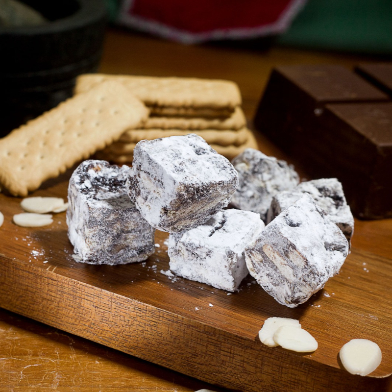Doces feitos com chocolate amargo, cacau e bolha maisena.