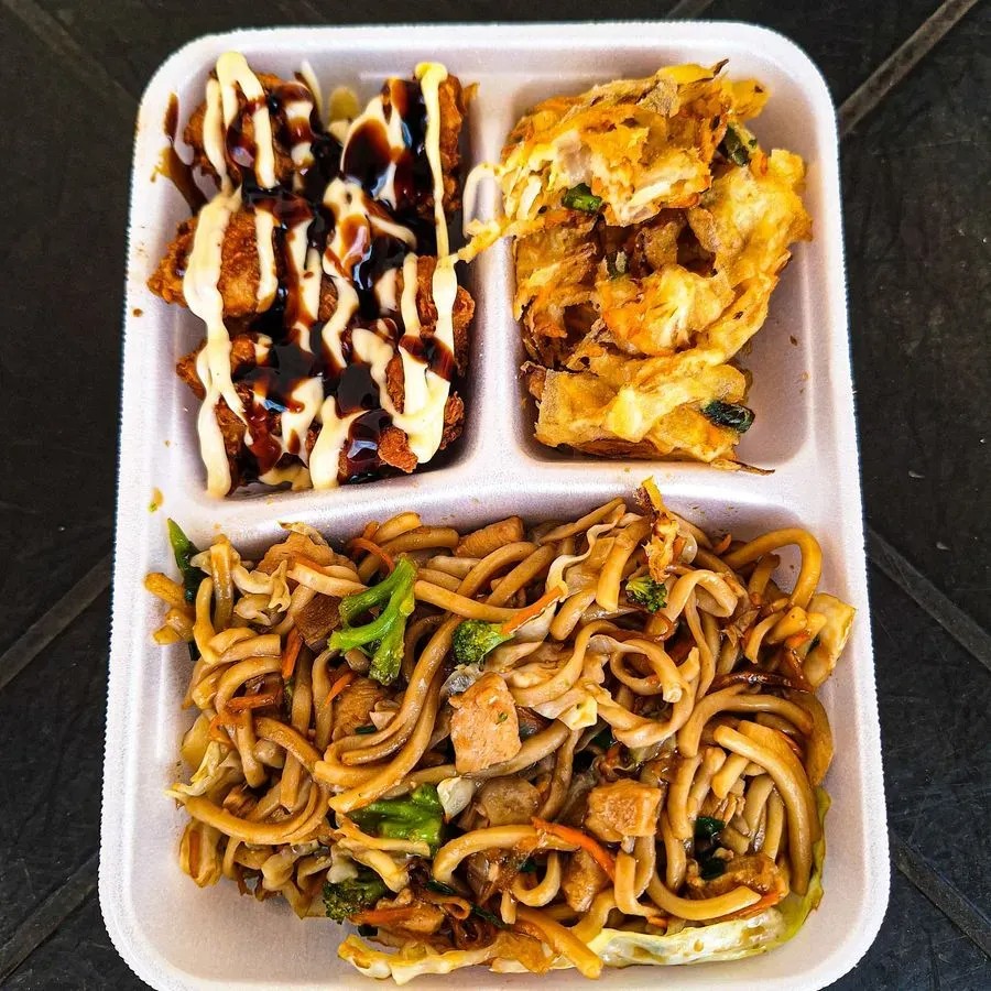 Macarrão, molho yakisoba da casa. karaage (frango frito japones), repolho branco, cebola, cenoura, brócolis.