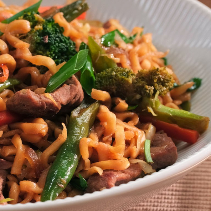 Nosso Yakisoba Frango e feito com macarrão, molho para yakisoba, mix de legumes (repolho branco, cebola, cenoura, brócolis, cebolinha) e frango.