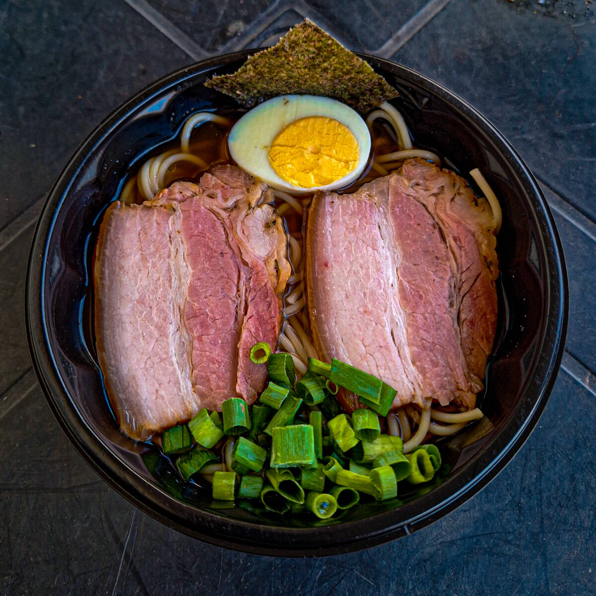 Macarrão, caldo de lamen da casa, Chiashu (carne de porco feita na pressão com shoyu e especiarias), ovo cozido, cebolinha, Nori