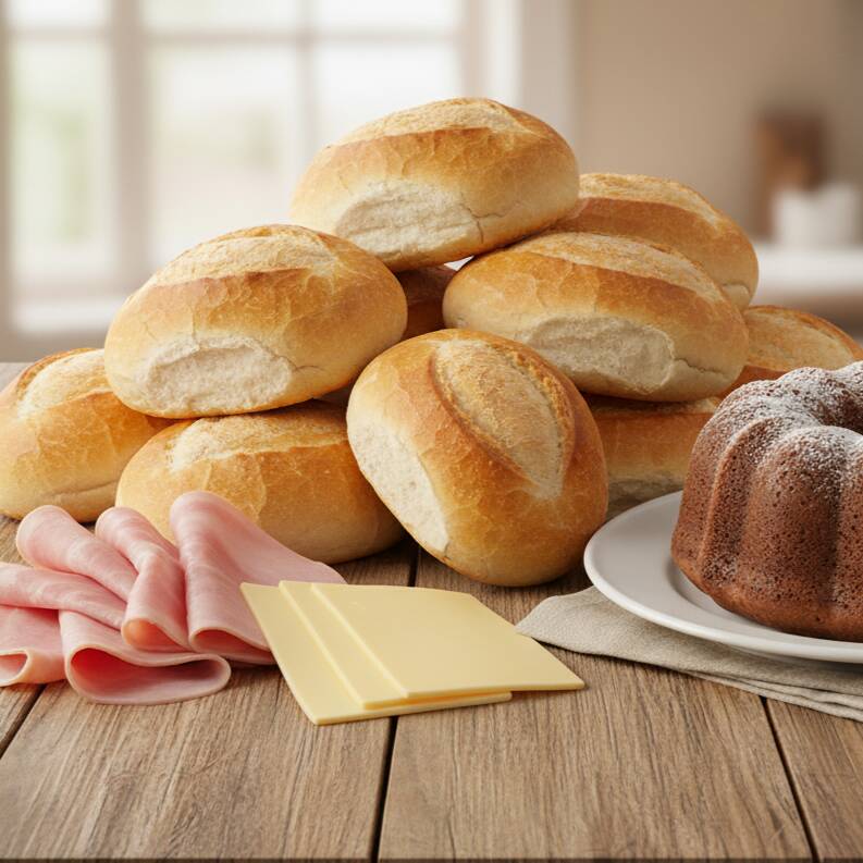 15 Pães + 300g mussarela + 300g presunto + Bolo a sua escolha. *Imagem ilustrativa