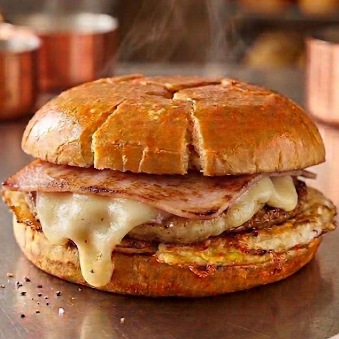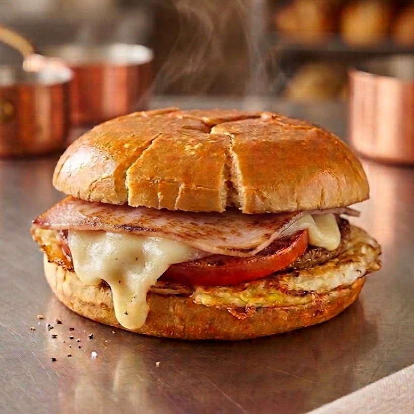 Pão brioche , hambúrguer tradicional, mussarela, presunto e maionese; imagem meramente ilustrativa