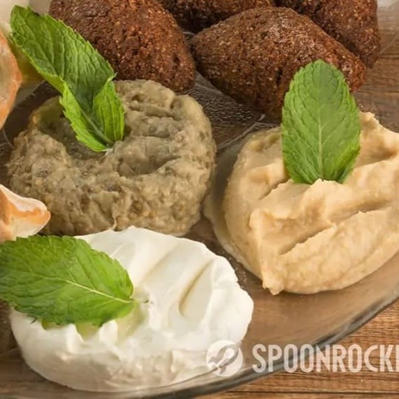 6 Kibes, 6 esfihas, 6 pães sírios + 100g coalhada seca, 100g babaganuchi e 100g homus