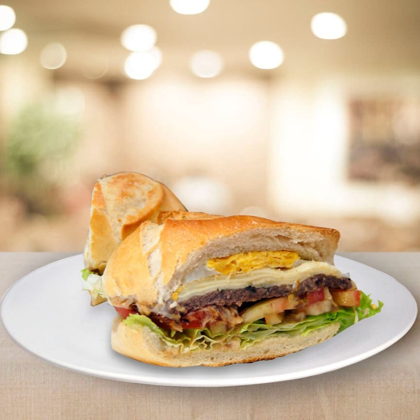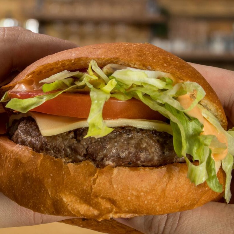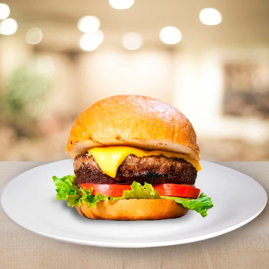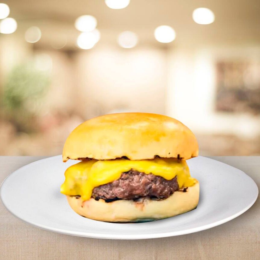 Pão premium, hambúrguer artesanal de costela com fraldinha (170g), queijo prato, alface e tomate