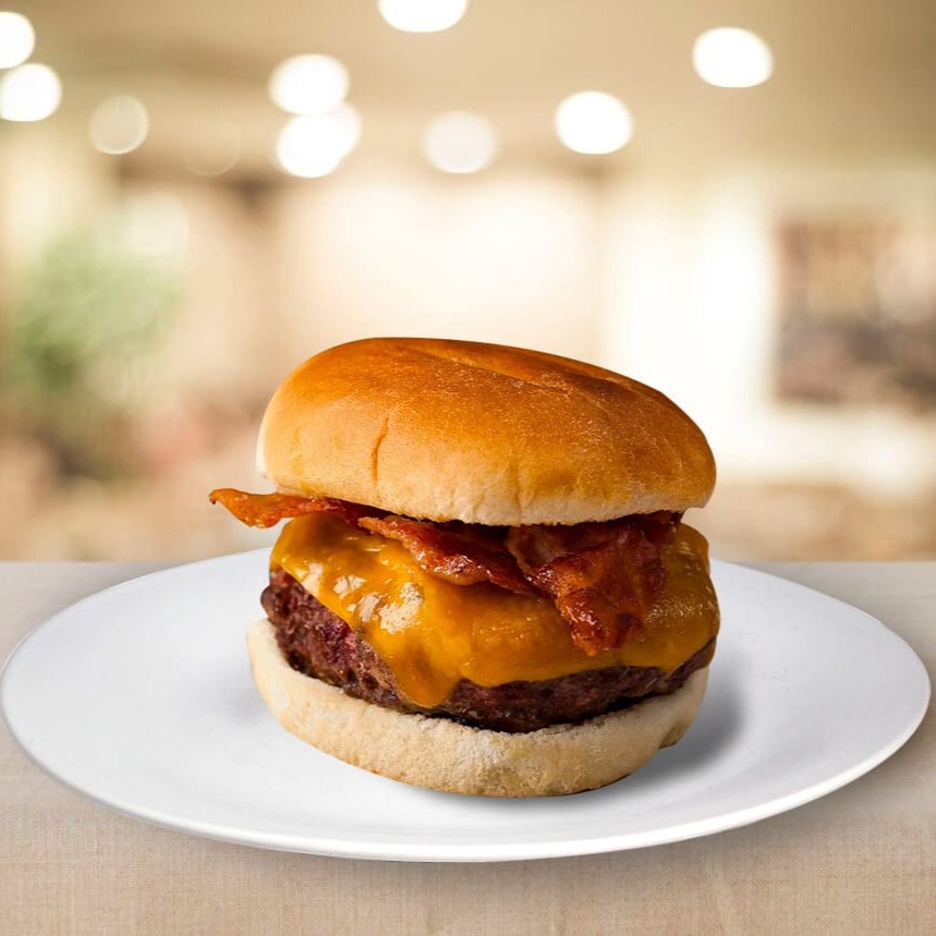 Pão premium, hambúrguer artesanal de costela com fraldinha, queijo cheddar e bacon