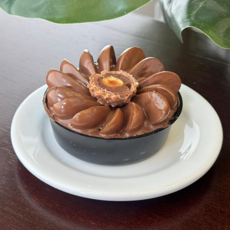 01 brigadeiro de panela feito com chocolate belga ao leite e branco, envolvido numa casquinha crocante de chocolate branco e coberto com leite em pó