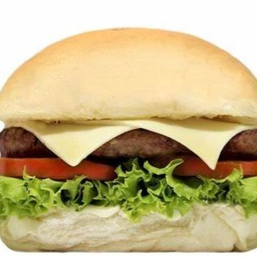Hambúrguer, presunto boníssimo, queijo, tomate, alface no pão de hambúrguer
