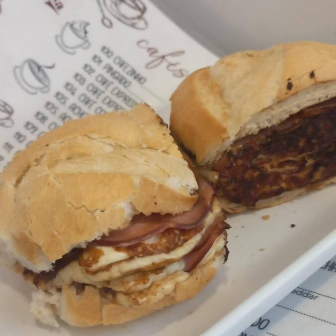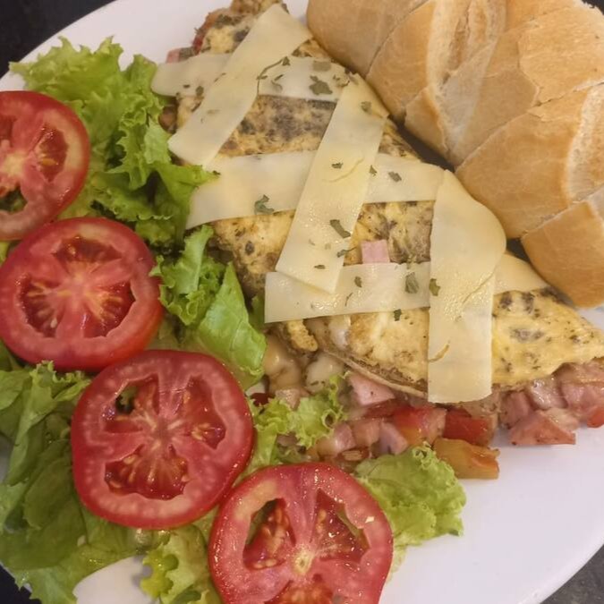 3 Ovos, presunto, queijo, cebola salteada, tomate, alface, pão fatiado e orégano, muito bem recheado