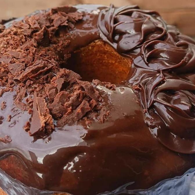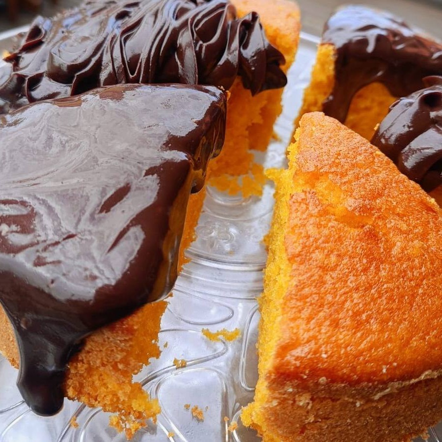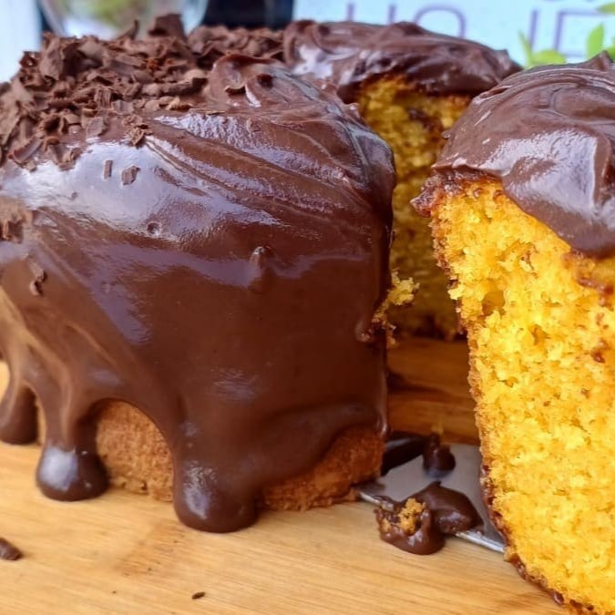 Bolo de massa artesanal fofinha feito com cenoura de verdade com cobertura de chocolate