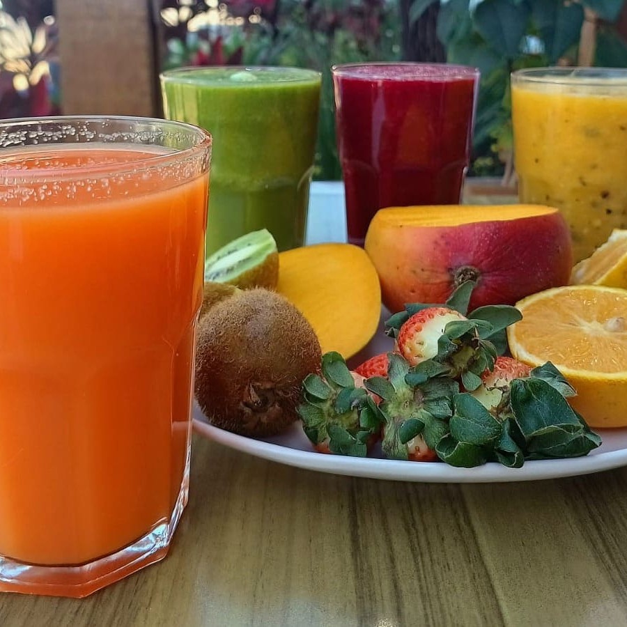 Cenoura, manga e suco de laranja. Sem Açucar. As fibras contidas nessa bebida são de grande ajuda para manter o sistema digestivo saudável. Melhora a função cerebral, na manutenção do sistema nervoso, melhora o humor e controla o estresse do Dia a Dia. A cenoura ajuda a prolongar o tempo de digestão dos alimentos diminuindo a fome ao longo do Dia, diminui os níveis de colesterol “ruim” e a gordura no fígado. A manga ajuda a combater inflamações e reduz o risco de doenças cardiovasculares, combate a gastrite e ajuda controlar a glicemia.