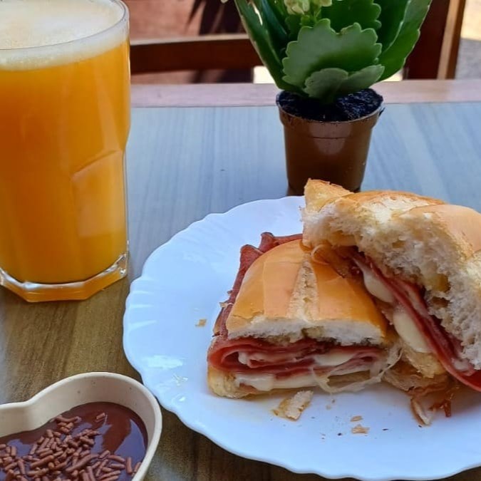 Suco de laranja de 300 ml com delicioso misto quente feito na chapa e bolo de pote de brigadeiro gourmet caseiro