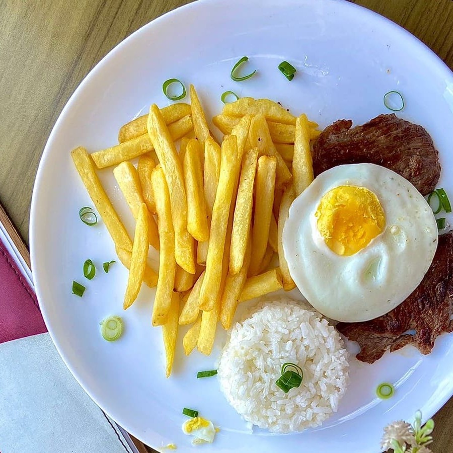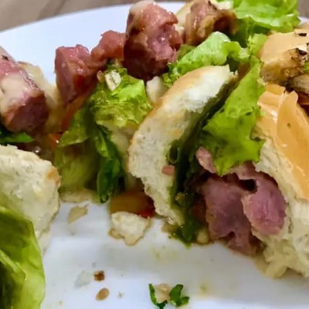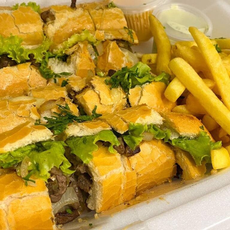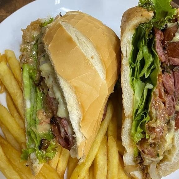 Pão de baguete, bife de alcatra em tiras, alface, tomate, molho especial e queijo (acebolado - opcional) Acompanha Fritas