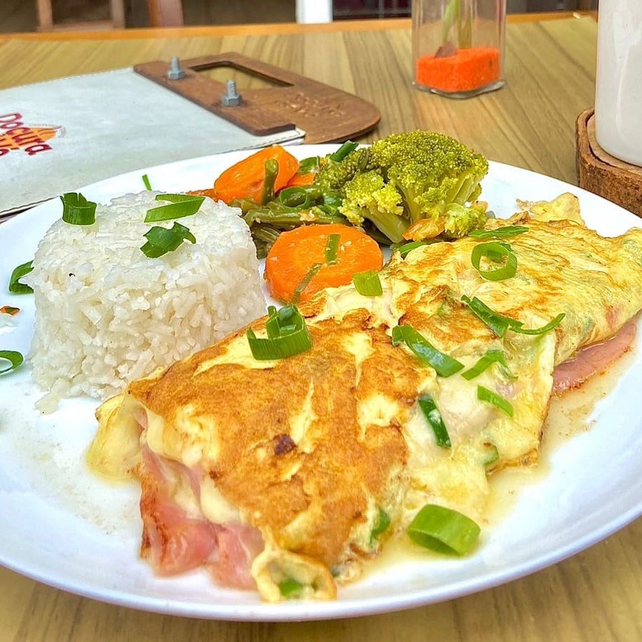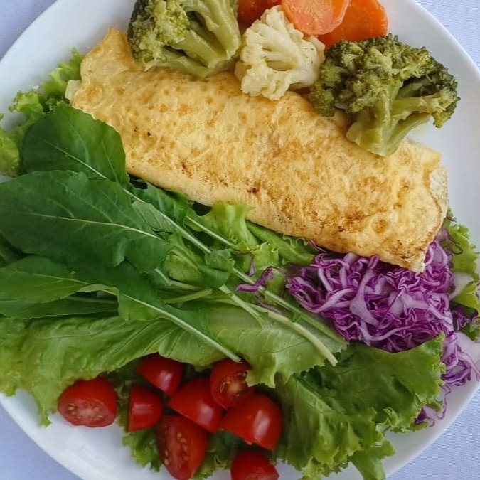 Experimente a deliciosa Executiva Omelete, uma combinação perfeita de ovos macios recheados com ingredientes frescos e saborosos, servidos com uma salada colorida e legumes frescos. Uma refeição equilibrada e saborosa para o seu Dia!