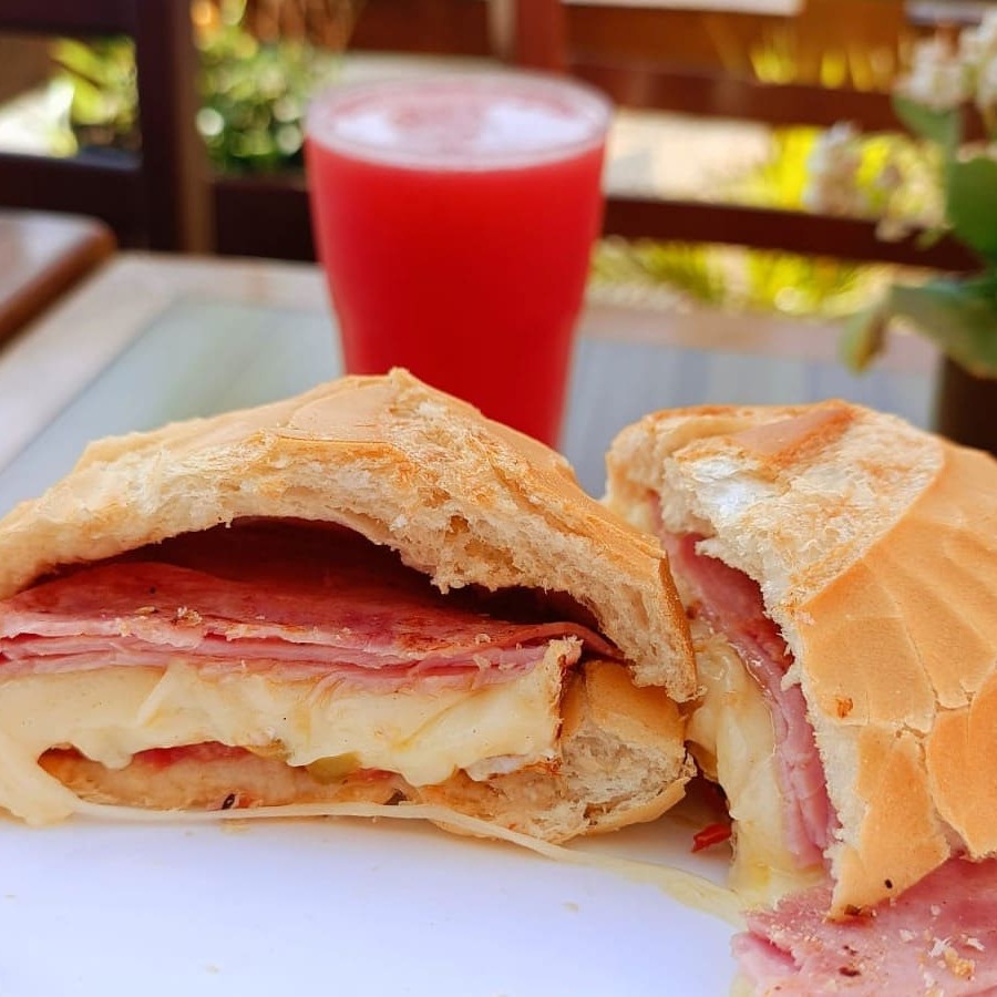 Paulistano (Pão com mortadela e queijo tostado na chapa) + suco natural de laranja de 300ml