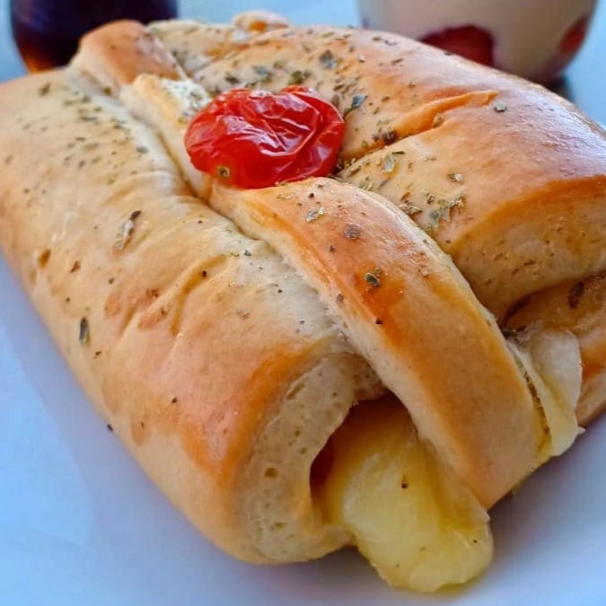 Salgado assado recheado com presunto e queijo e bebida a sua escolha