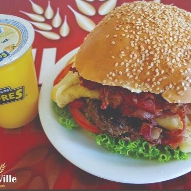 Pão/hamburguer artesanal/bacon/queijo/salada, suco laranja 200ml
