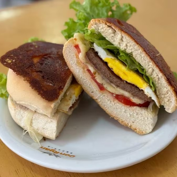Muçarela, presunto, tomate, ovo, carne de hambúrguer, alface e orégano.