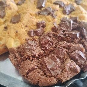 Para os indecisos de plantão criamos o cookie duo. Que é meio a meio, meia massa branca e meia massa preta com cobertura de chocolate