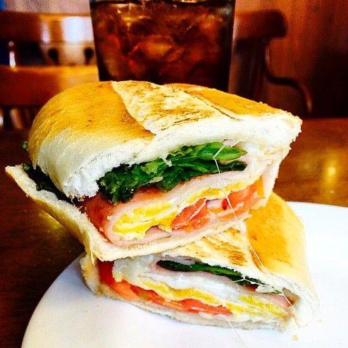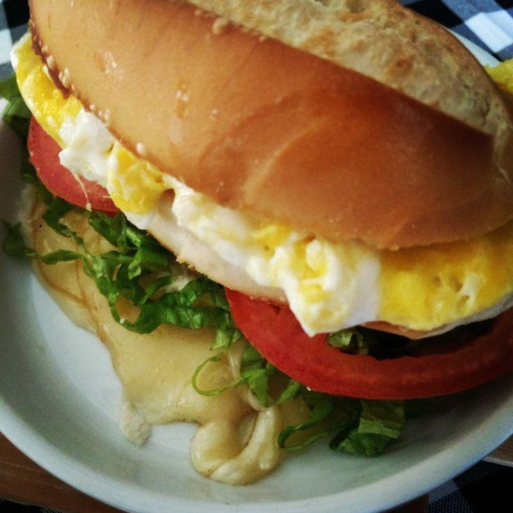 Pão francês, requeijão, alface, tomate, ovo, presunto e mussarela.