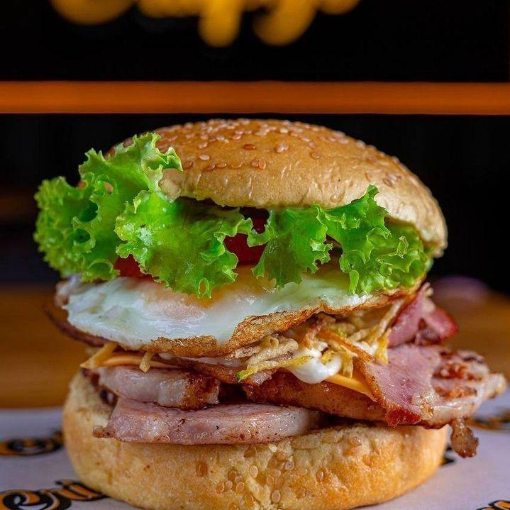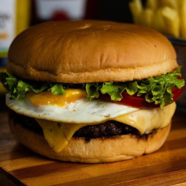 Pão de hamburger, maionese, hamburger, mussarela, ovo, bacon, alface e tomate.