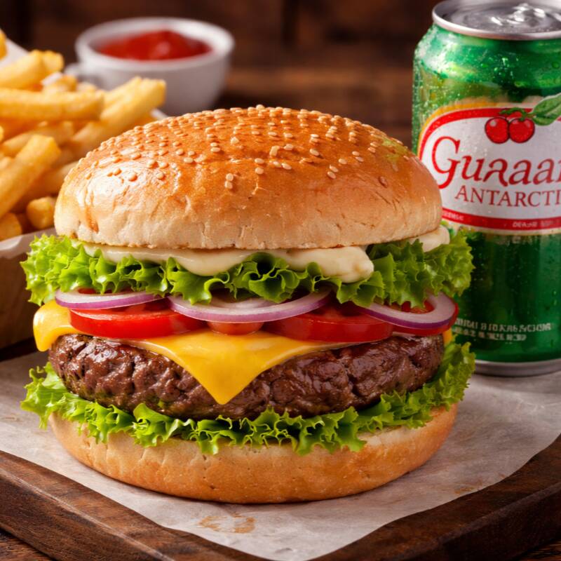 Pão de hamburger, maionese, hamburger, mussarela, bacon, alface e tomate.