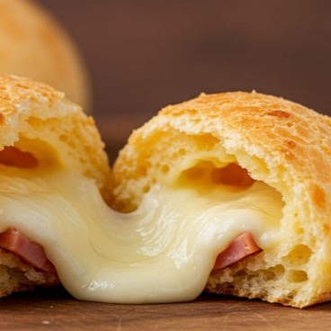Pão de queijo fresquinho com delicioso recheio de presunto e queijo