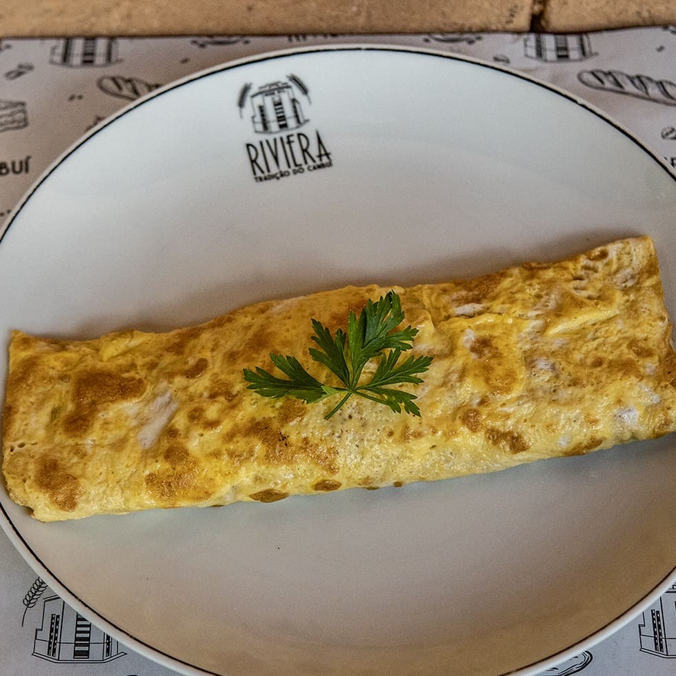 Arroz, feijão, farofa , omelete de presunto, queijo e tomate, ou omelete de peito de peru com queijo minas e tomate.