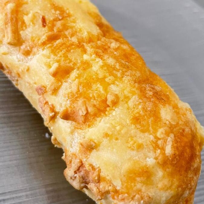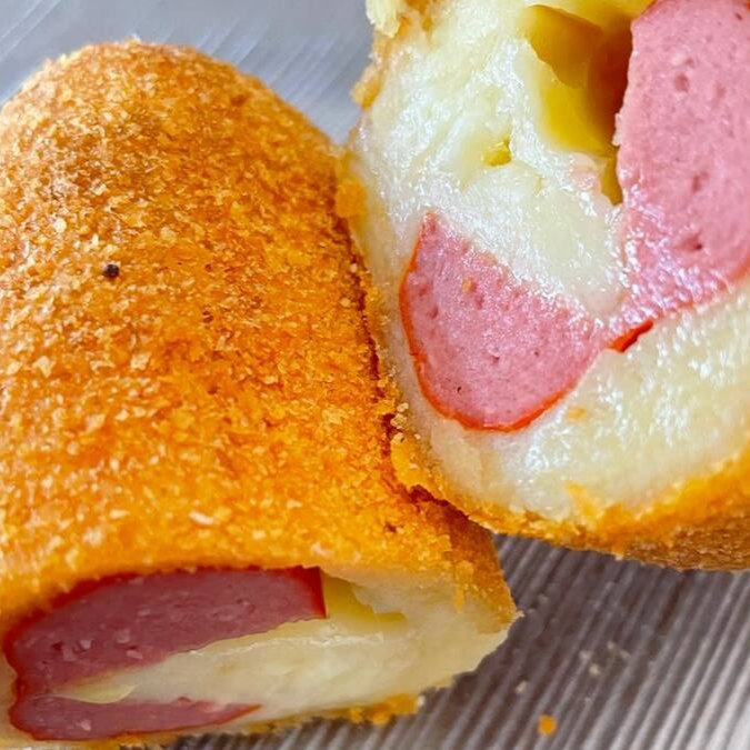 Massa de batata, com recheio salsicha com queijo e Catupiry.
