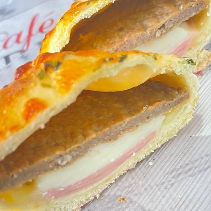 Carne de hambúrguer, presunto e mussarela.