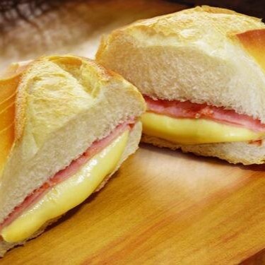 Pão francês com fatias de presunto e muçarela.
