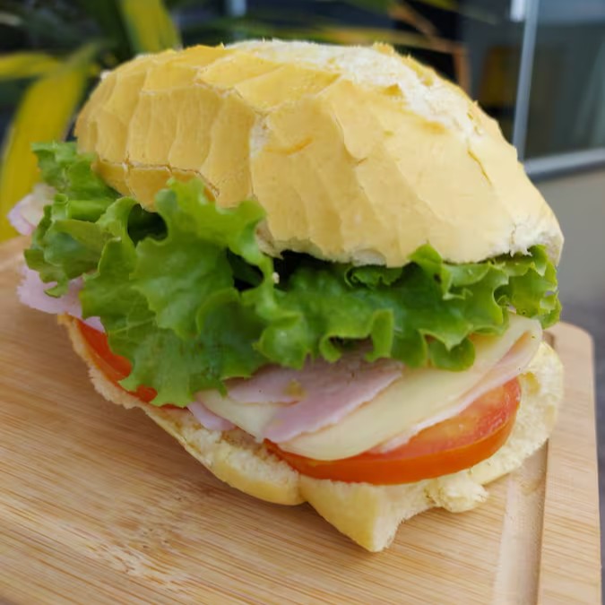 Pão francês, presunto, muçarela, alface, tomate e cenoura ralada.