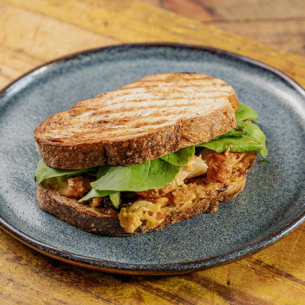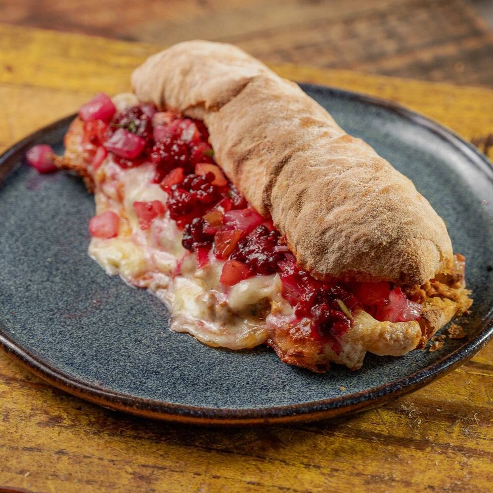 Sanduba feito na nossa ciabattinha recheada com pernil desfiado, temperado com cebola, alho, cenoura e molho de tomate + queijo mussarela e vinagrete de amora.
