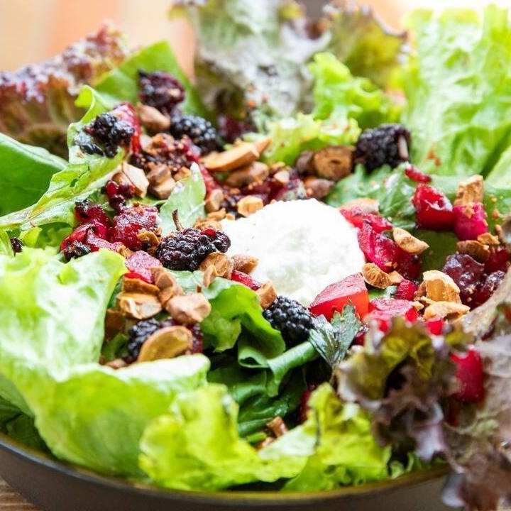 Mix de folhas do Dia, vinagrete de amora, queijo boursin da Fazenda Atalaia e castanha de caju tostada.