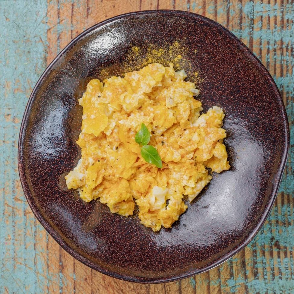 3 ovos mexidos temperados com sal, cúrcuma e pimenta do reino. -