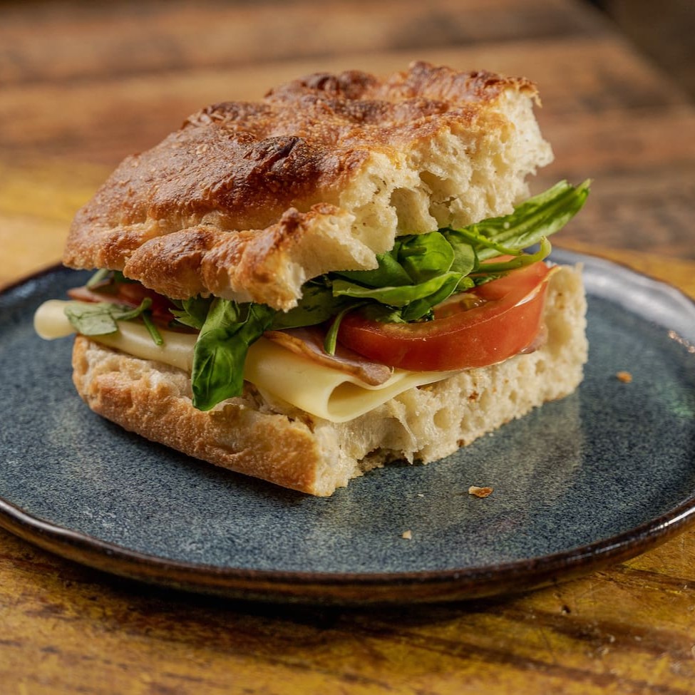Maravilhoso Lanche Natural na Massa de Focaccia, com Muçarela, Catupiry, Presunto Defumado, Tomate e Rúcula.
