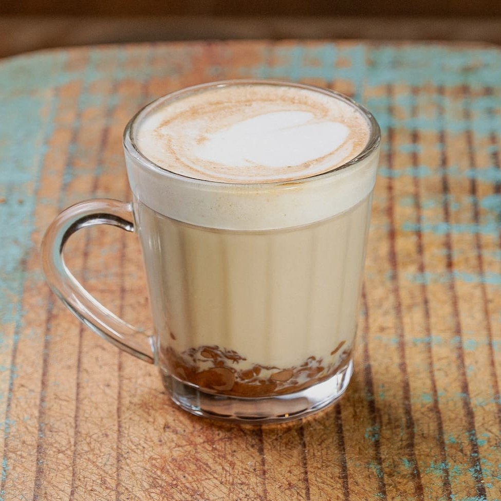 Café Espresso, leite vaporizado e gotas de chocolate ao leite.