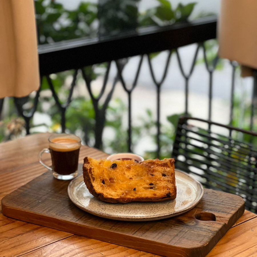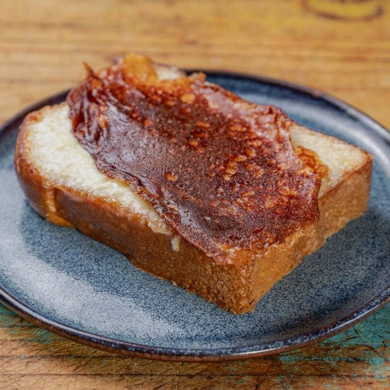 Deliciosa fatia de panetone da alma ,feito com manteiga na chapa, e acompanha flor de sal