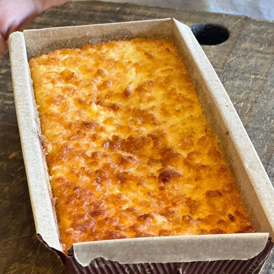 Delicioso bolo de mandioca, coco e queijo meia cura aprox 350g