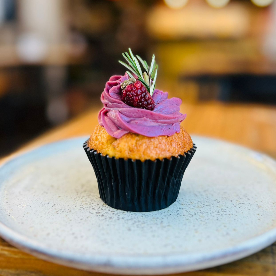 Muffin de laranja com alecrim e curd de amoras