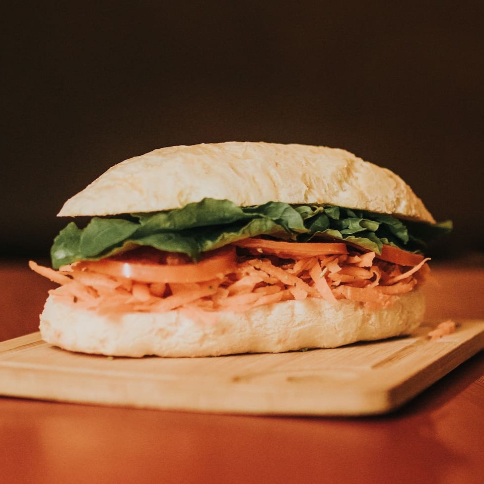Pão de queijo recheado com tomate, cenoura ralada, rucula e oregano.