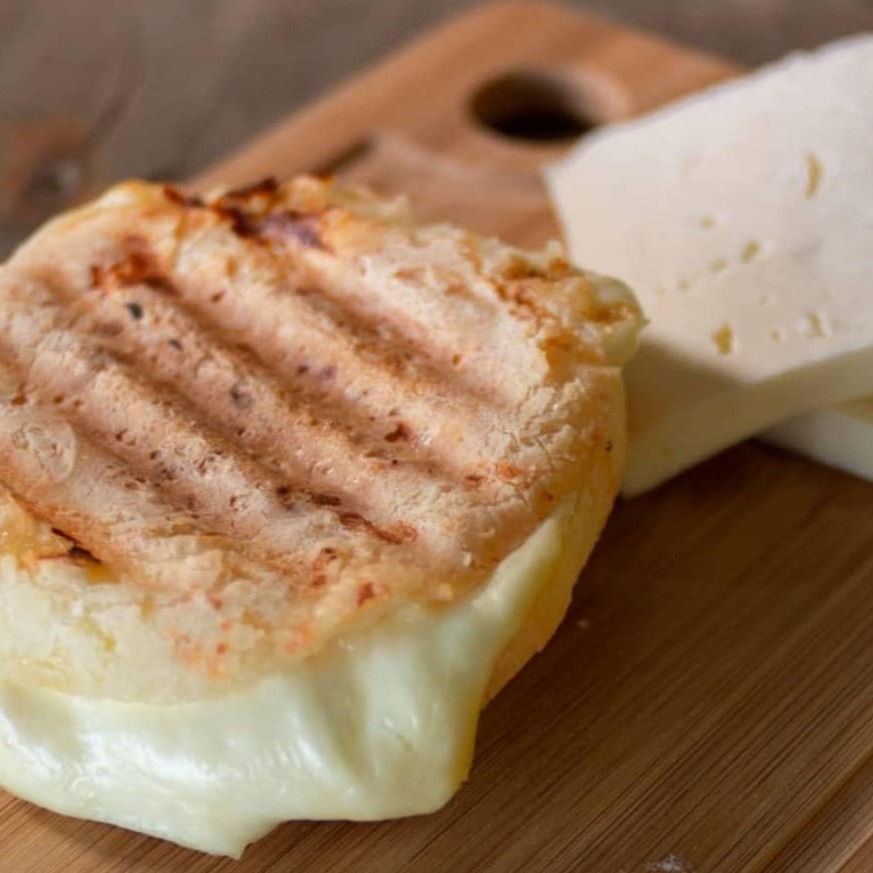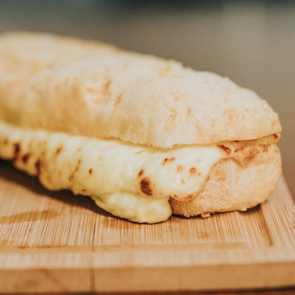 Pão De Queijo Pancremo Recheado Com Uma Fatia De Queijo Minas Gratinado E Uma Generosa Porção De Doce De Leite.