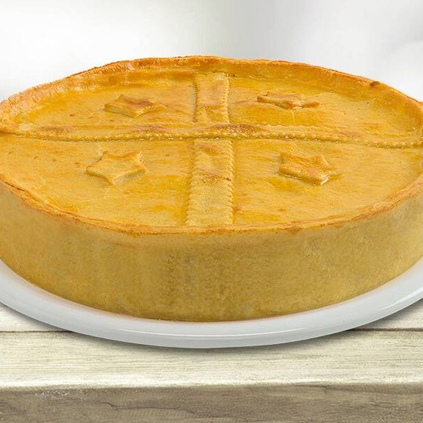 Torta salgada com recheio de palmito ou frango com requeijão.