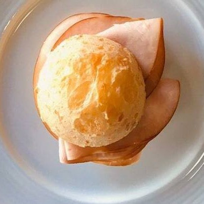 Pão de queijo recheado com queijo branco e peito de peru defumado.