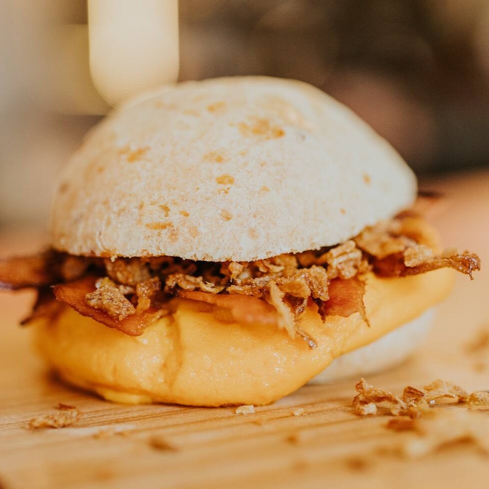 Pão de queijo recheado com uma porção generosa de cheddar, fatias de bacon, cebola crisp e orégano.