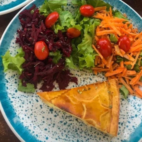 Torta de palmito ou frango com queijão mais Mix de alface, rúcula, cenoura, beterraba, pepino e azeite. Acompanha sal e tempero especial para saladas.