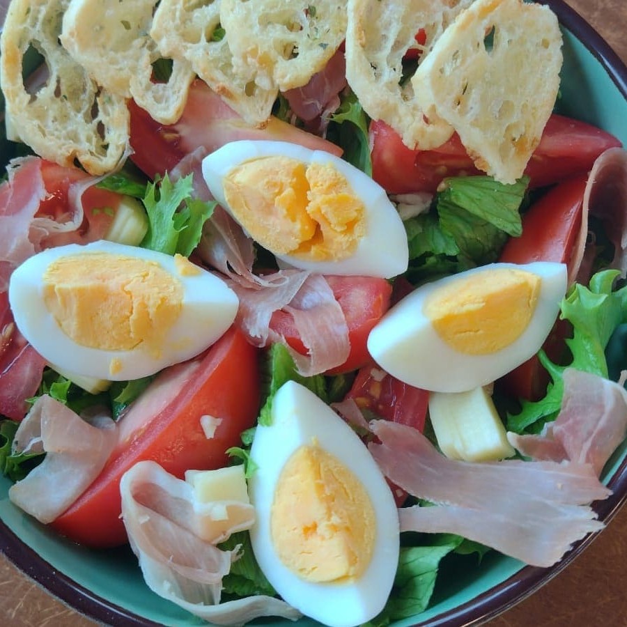 Mix de alface, ovo cozido, tomate, presunto parma, mussarela e azeite. Acompanha sal e tempero especial para saladas.