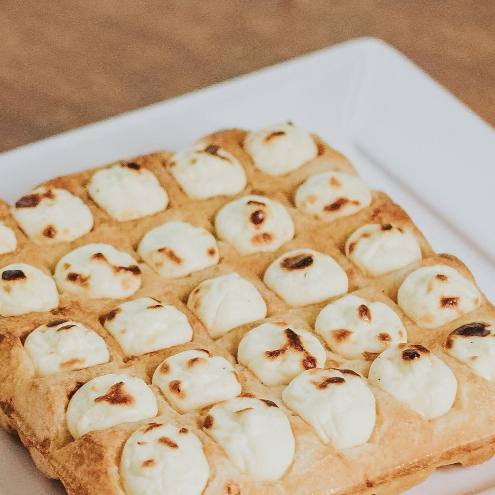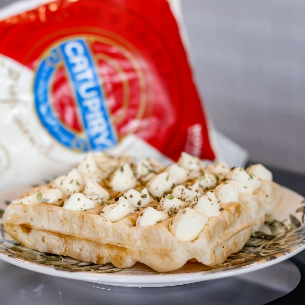 Waffle de massa de pão de queijo Pancremo, coberto com Catupiry roriginal e orégano.